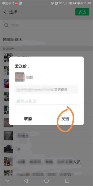 6、点击后会弹出选择接收聊天记录的人,选择后在弹出的窗口中点击“发送”即可: