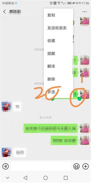3、打开聊天窗口,长按需要转发的其中一条聊天记录,然后在弹出的对话框中选择“多选”: