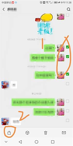 4、点击多选进入选择页面,然后选择多条聊天记录,然后再点击屏幕左下方的箭头分享标志: