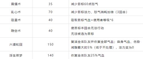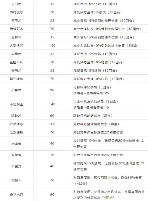 2、部分特技有低级和高级两种效果,比如苏醒术是复活一个友方单位15%气血+30%内伤,而复活术是30%气血+60%内伤。