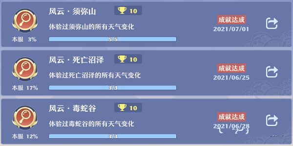 (2)【探索】,共300点成就都可以白嫖,每张地图都去逛一逛,因为游戏内的时辰是固定的,但每张地图的天气不固定,所以闲暇时间可以去各地图跑一跑,说不定就有各种雷暴天雨天触发奇缘,还能顺带完成地图的天气成就。