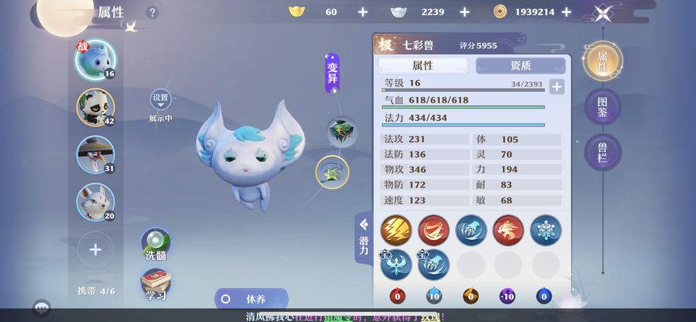 所以我的建议是,打造一个变异的,不追求6技能的高资质宝宝。这样成本会大幅下降!为什么这么说呢?举个例子,我还是想要一个灵蝶,但我不追求6技能,那我只要看到一个变异的,资质高的就停手!那我技能格子怎么办?用最便宜的低级技能书顶!