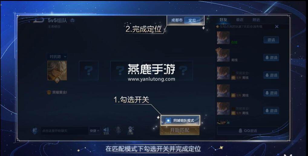 1、首先打开游戏,开始匹配,点击勾选同城组队模式,并完成定位;