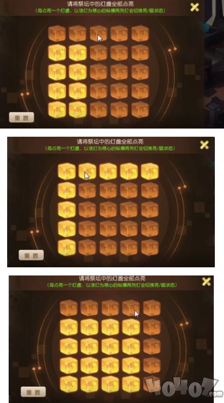 玩家需要将祭坛中的灯盏全部点亮(每点亮一个灯盏,以该灯为核心的纵横两列灯会切换亮状态)