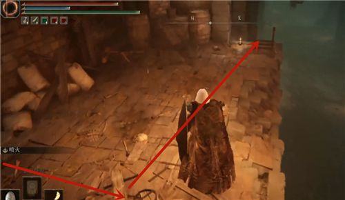 出门左转从爬梯下去,注意下方有怪,注意翻滚闪避。