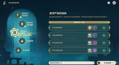 对于其它角色练度普遍不高的情况下,建议选择2倍积分倍率,靠着试用角色娜维娅拿满3000分挡位比较轻松。其它角色练度高,就选4倍积分倍率。