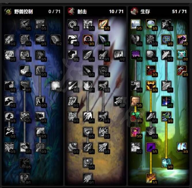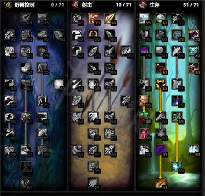 不缺命中率的可以考虑这套天赋,放弃3点专注瞄准,将强化猎人印记点满,并且点出2点致死射击来提升输出。