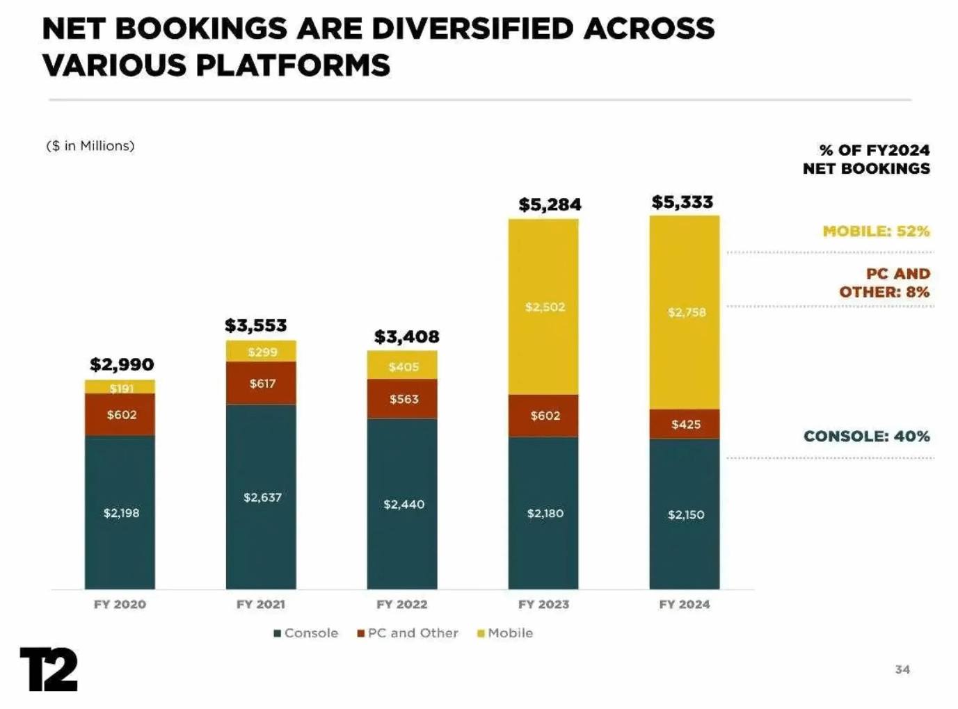 根据R星母公司Take-Two最新发布的财报数据,2024年中,PC平台游戏收入仅占该公司总收入的8%,与之相比,主机平台收入占比达到了40%。尤为引人注目的是,移动游戏在收入占比中独占鳌头,高达52%。