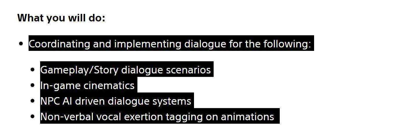 近日,又有新消息传来。一则高级对话设计师的招聘启事引发了广泛关注,这似乎暗示顽皮狗有意在游戏中运用 AI 技术来生成 NPC 对话。从招聘信息中工作职责的描述来看,这位高级对话设计师将肩负起游戏多个关键环节的对话设计重任,涵盖玩法场景以及过场动画等方面。