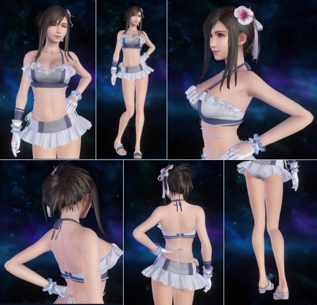 这套服装来自《最终幻想7:重生》,泳装充满了夏日的清爽感,将蒂法的优雅与性感结合,单薄的布料也将蒂法白皙的肌肤一一暴露,极具诱惑力。此前还有外媒感叹,这套服装是SE为这款游戏准备的最好的营销手段。
