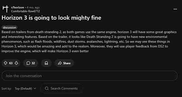 《死亡搁浅2》相比前作在视觉效果上有了显著提升,呈现出令人惊叹的风景和细腻画面,这些都得益于Decima引擎的强大性能。这让PlayStation玩家对《地平线3》的表现充满期待。不少玩家认为,经过多年优化的Decima引擎将为《地平线3》带来更大的技术突破。