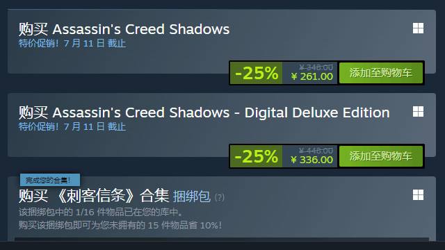 Steam 夏季特卖活动现已火热开启,《刺客信条:影(Assassins Creed Shadows)》迎来了首次价格优惠。此次折扣力度颇大,国区标准版售价直接降至 261 元,降幅达 25%。
